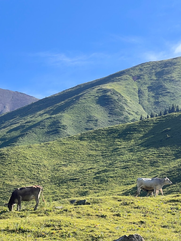 那是一种无法用单一色彩描绘的绿。在高远的蓝天和洁白的雪峰之间,阳光洒落在广袤的草原上,不同层次的绿彼此交织、晕染,好似大自然调色板上最得意的一笔:有如翡翠般晶莹的翠绿,柔和明亮;也有藏在山腰间、牧道旁的深绿,厚重深邃;更有阳光下泛着金光的金绿,好像要将整个山谷点亮。最动人的(分别心使然哈哈),是那种“茸毛光绿”——晨曦照耀,草尖上凝着夜露,草叶毛茸茸地闪着光,如同天神遗落的羽衣,细腻轻盈,令人屏息。